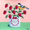 Gemälde Fraise avec oiseau von Sally B | Gemälde Naive Kunst Tiere Acryl