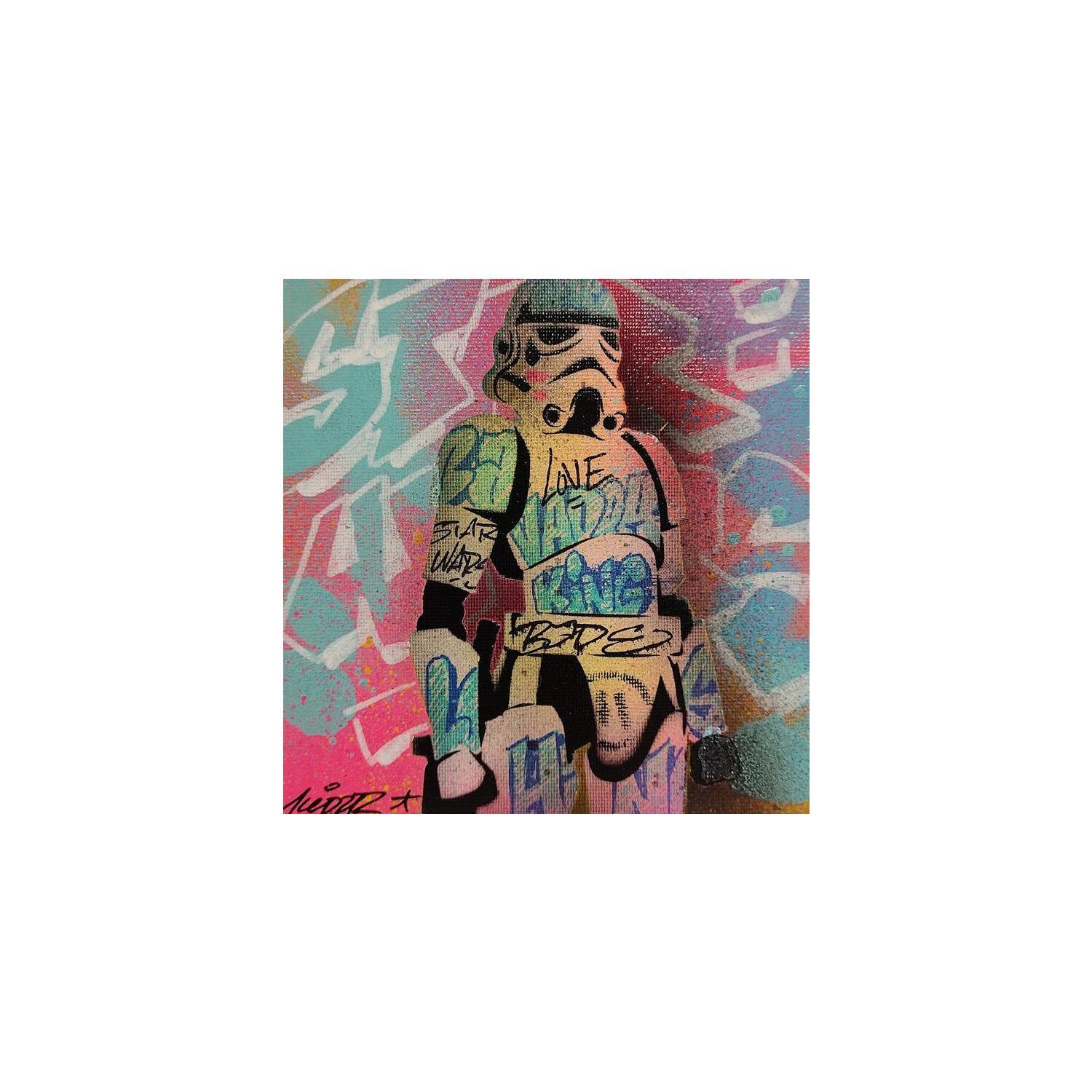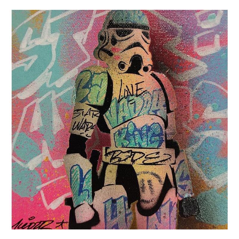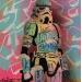 Der Künstler verwendete Graffiti, Acryl auf Leinenkarton, um dieses Kleine Gemälde zum Thema "Pop-Ikonen" anzufertigen.