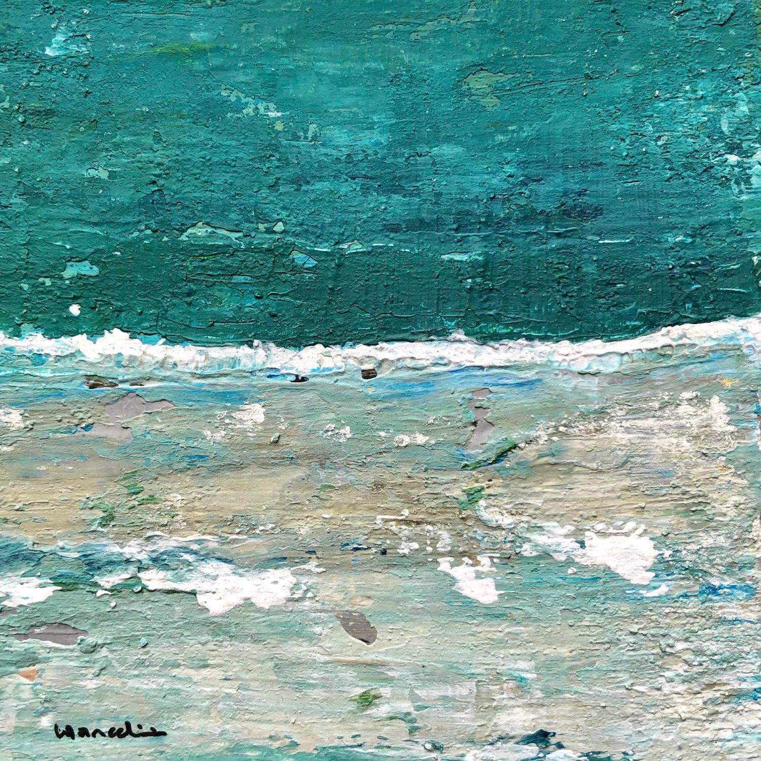 Die Künstlerin verwendete die Technik Acryl und Marmorpulver, um dieses kleinformatige Gemälde auf dickem Papier im abstrakten Stil mit dem Thema Marines zu schaffen.