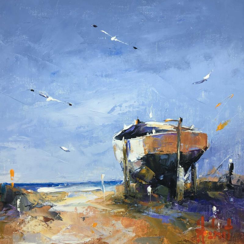 Franck Hébert hat die Malerei seit Anfang der 90er Jahre zu seinem wichtigsten Ausdrucksmittel gemacht, nachdem er viele Jahre lang Gitarre gespielt und unterrichtet hatte. Er lernte viel und besuchte die Kunstschule in Caen sowie zahlreiche Maler aus der Region, deren Vielfalt seine Arbeit bereicherte. Seit Anfang der 2000er Jahre nahm er an zahlreichen Ausstellungen teil und wurde auf Messen für seine Arbeit belohnt. Heute widmet er sich in seinem Atelier in Pleneuf Val André in der Bretagne ganz der Malerei und stellt in zahlreichen Galerien in ganz Frankreich aus. Frank reist gerne und fertigt viele Skizzen an, um dann seine Erinnerungen an Paris, Venedig oder Marokko in Werke aus Ocker und Gold zu verwandeln. Er bleibt zwar immer im Bereich der Gegenständlichkeit, zögert aber nicht, die Abstraktion zu streifen, um seine Gewohnheiten zu durchbrechen und immer mehr Leben in seine Malerei zu bringen.