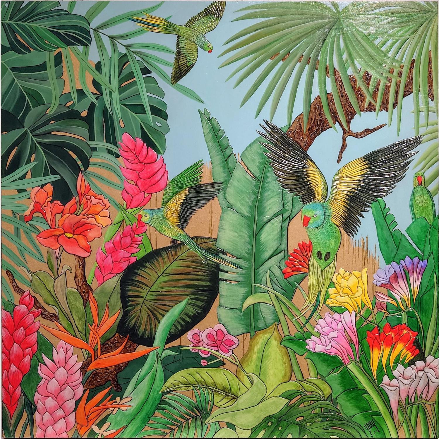 PERROQUETS D'INDONESIE Gemälde PERROQUETS D'INDONESIE  von Geiry | Gemälde Materialismus Landschaften Natur Tiere Holz Acryl Pigmente Marmorpulver