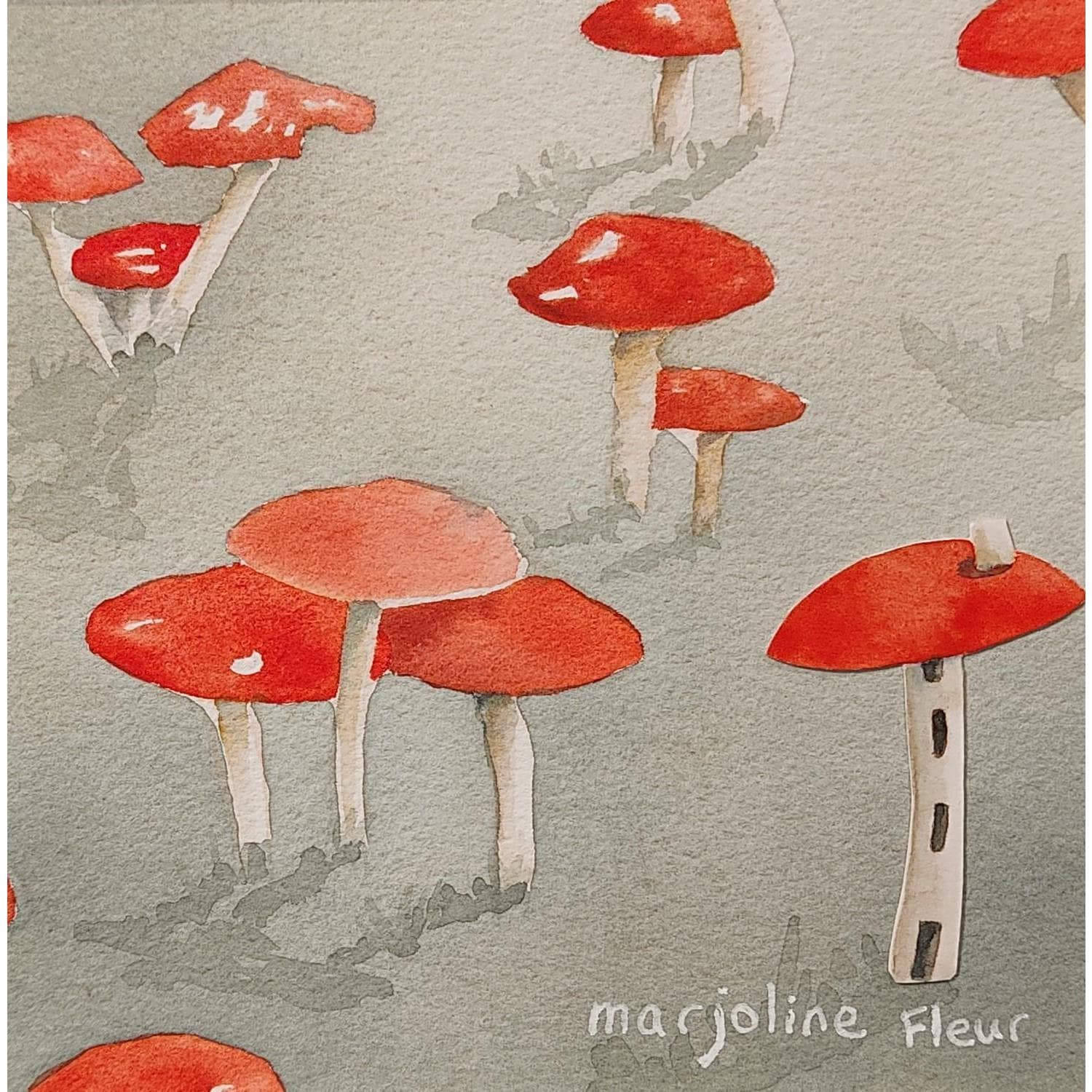 Gemälde Champignons von Marjoline Fleur | Gemälde Naive Kunst Aquarell