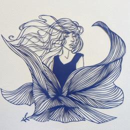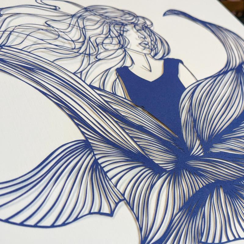 Die Künstlerin zeichnete und schnitt dann das blaue Papier mit einem Skalpell sorgfältig aus, um dieses kleinformatige Werk mit seinem einzigartigen Stil zu schaffen.