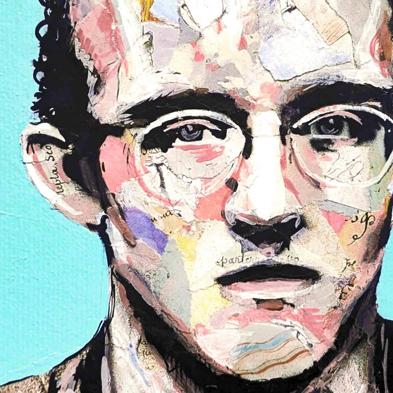 Für seine Herstellung hat der Künstler Collage, Tinte und Acrylfarbe auf dickem Papier verwendet. Das Format dieses Porträts ist 19x19cm.