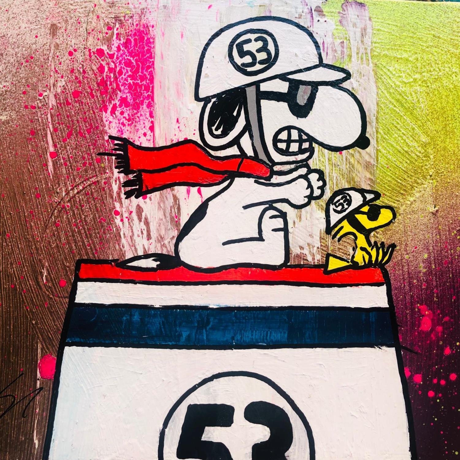 Der Künstler verwendete Acryl, Graffiti auf Pappe, um dieses Kleine Gemälde zum Thema "Pop-Ikonen" anzufertigen.