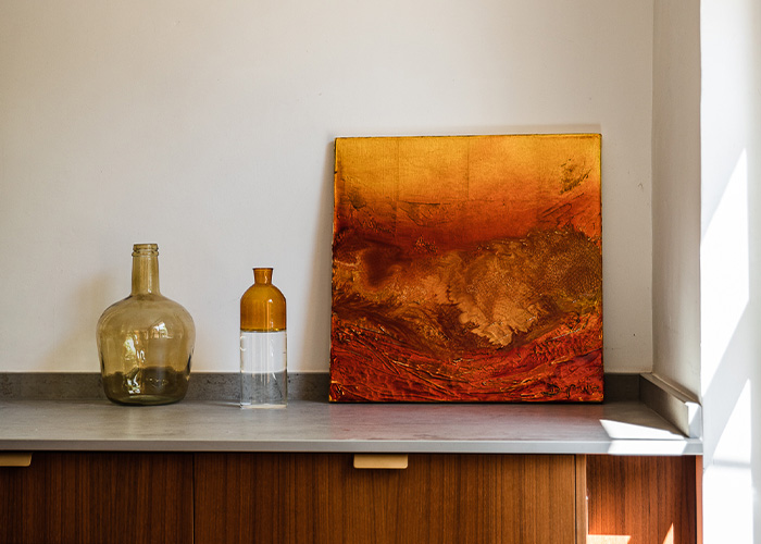 Jede Leinwand ist eine Explosion der Farben: Glühende Rottöne, leuchtende Orangetöne und schimmernde Gelbtöne vereinen sich zu Kunstwerken, die den Betrachter in eine Welt der Farben und Emotionen entführen.