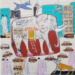 Der Künstler verwendete verschiedene Techniken, um dieses kleinformatige Gemälde auf Papier im Stil der Art Singulier zum Thema Tiere zu schaffen.