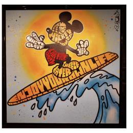 Dieses einzigartige und originale zeitgenössische Kunstwerk "Mickey Surfing" in dem Stil "" wurde von dem zeitgenössischen Künstler Cmon kreiert.