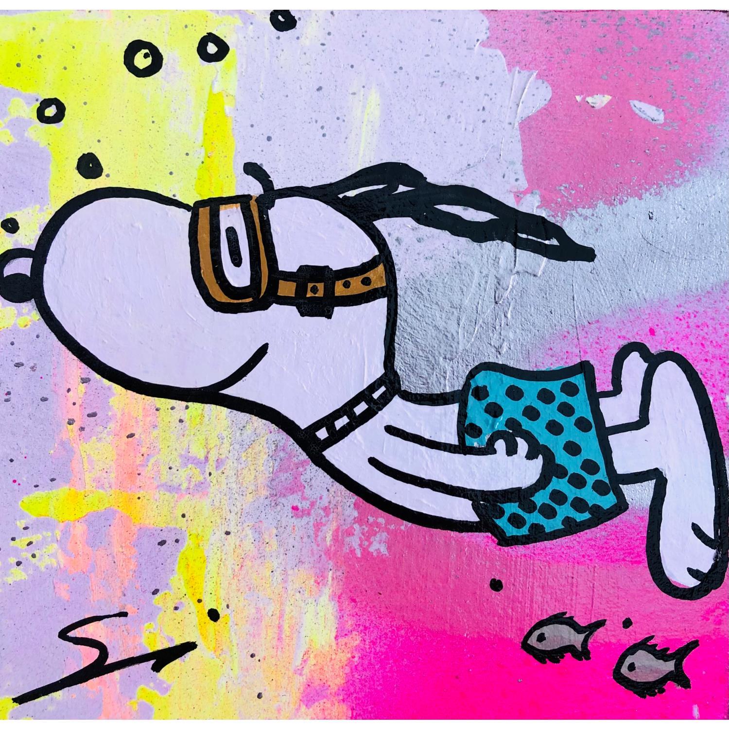 Dieses einzigartige und originale zeitgenössische Kunstwerk "Dive snoopy" in dem Stil "Pop-Art" wurde von dem zeitgenössischen Künstler Mestres Sergi kreiert.