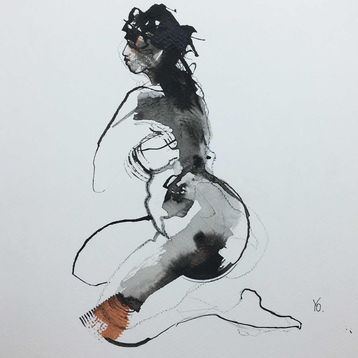 Yo was born and raised in the Paris region in a family where art and design were important. The stroke of a pen from her father fascinated her and drawing competitions were held regularly at home. Very soon she was acquainted with the human figure. Her father, passionate about the poster artists, illustrators and cartoonists of the twentieth century, transmitted this interest to her. After law school, she worked as a lawyer for ten years while attending workshops sponsored by the city of Paris. In 2001, she left her salaried work to attend the Versailles School of Fine Arts, where she was devoted entirely to her passion: live models. This form of expression fascinated her and allowed her to tell stories. The body is an anchor in her work. It is the singular envelope of emotions and moods. Yo combines her energy and that of her models, drawing with instinct and precision the movements and attitudes of the body.