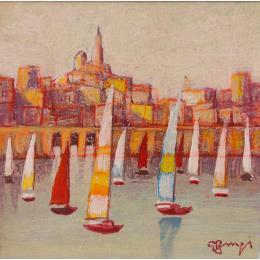 This unique and original contemporary artwork "Régate à Marseille 3 AQ58" on the subjects of Landscapes, Marine has been created by the contemporary artist Burgi Roger.