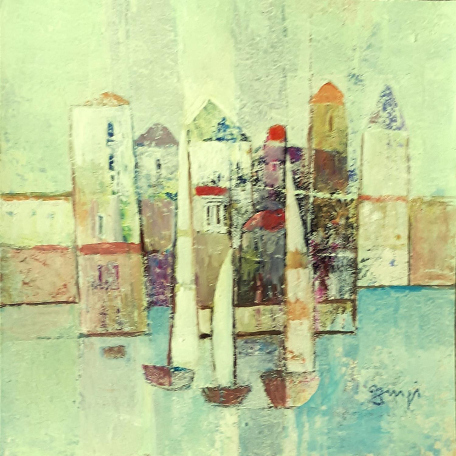 Painting AL70 COMPOSITION BLEUE by Burgi Roger | Painting Figurative Urban Marine Acrylic