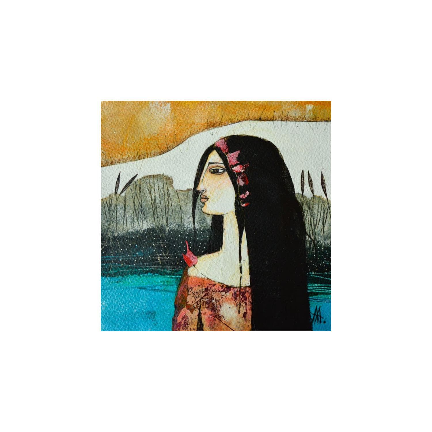 Almudena grew up in a family of artists in Spain. Her great grandfathers were painters and sculptors, and introduced her at a young age to artistic techniques. This taste of creation never left her and she attended a Ceramics School. At the end of her studies, she studied sculpture with Aurora Cañero (bronze sculptor) whose enthusiasm and passion would forever mark her career. From that moment, Almudena was fully dedicated to creating ceramics by mainly creating female faces and murals. She plays with materials and likes to mix soil with wood. In 2006, an accident forced her to stop for a while, but her incessant need to create would incite her to explore painting as a new challenge both in terms of medium and colour. Almudena was overwhelmed with new sensations and took a liking to this form of expression. After the volume of sculpture, painting seemed light, agile and immediate: it was a clear choice for her.