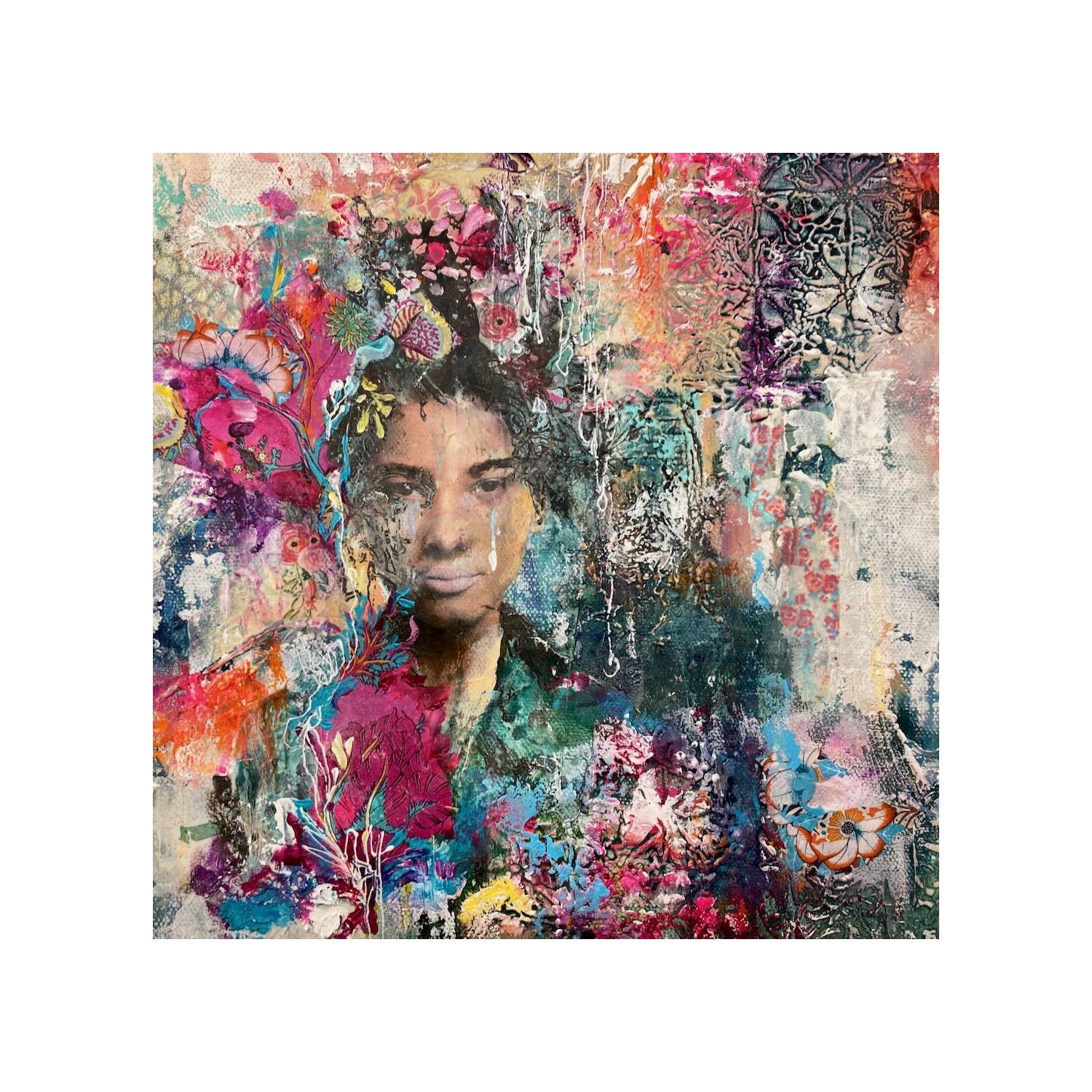 The artist used Gluing, Oil, Acrylic media on Canvas to create this Figurative, Small size painting.