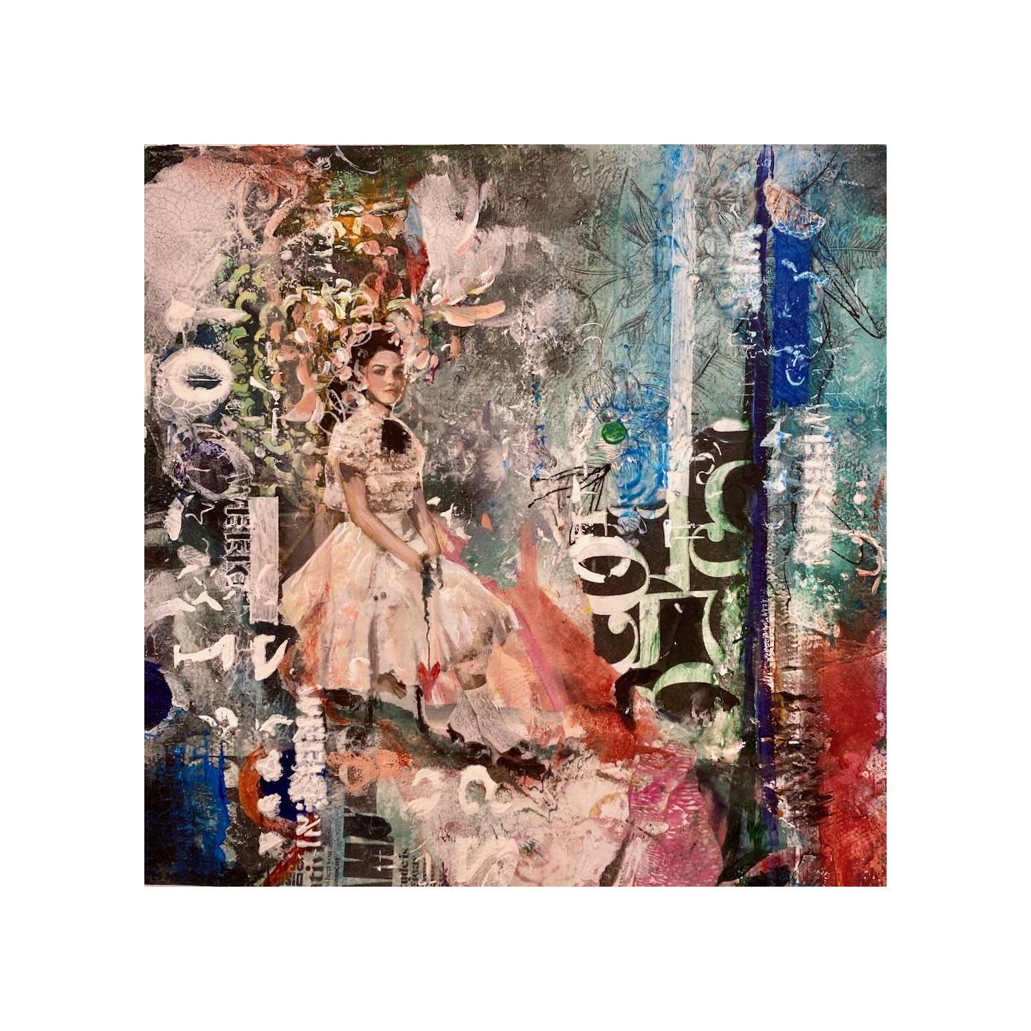 The artist used Gluing, Oil, Acrylic media on Paper to create this Figurative, Small size painting.