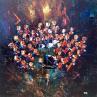 Le concert avec pianiste is a work that oscillates between abstraction in the periphery and naive art in the center and the representation of the instrumentalists. The motif is painted in knife and oil, and plays on a harmony of warm colors (shades of red, orange) and metallics (gold, copper, silver...). The square heads of the figures are inspired by Nicolas de Staël's "Parc des Princes" series. The staging highlights the central pianist, playing on circularity (the formation) and verticality (the background). The conductor, isolated and in a masterly posture, concludes the lower part of the work. The overall tone is flamboyant or baroque... depending on one's sensibilities.