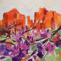 This unique and original contemporary artwork "Spring flowers in red rocks" has been created by the contemporary artist Lunetskaya Elena.