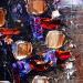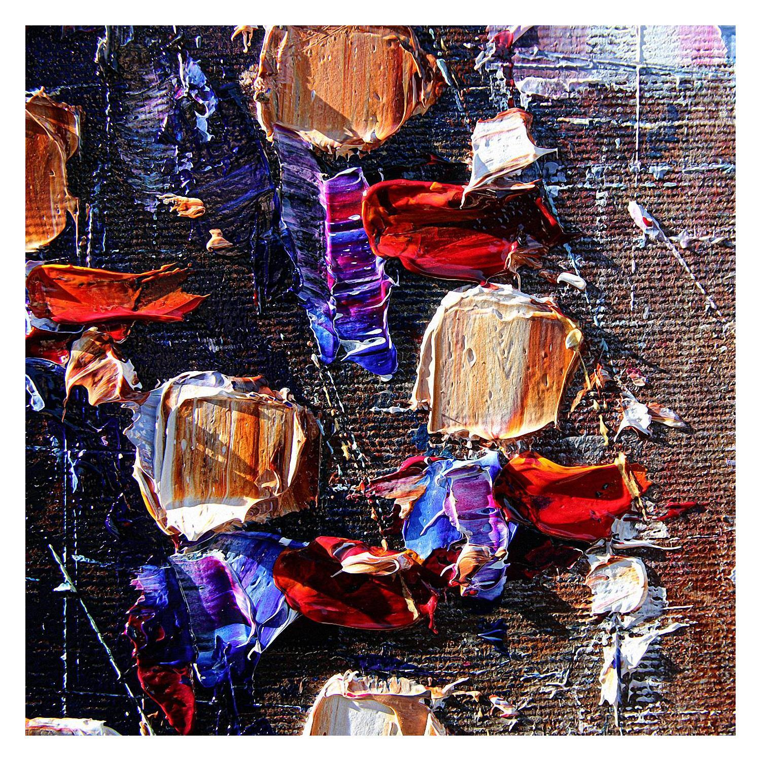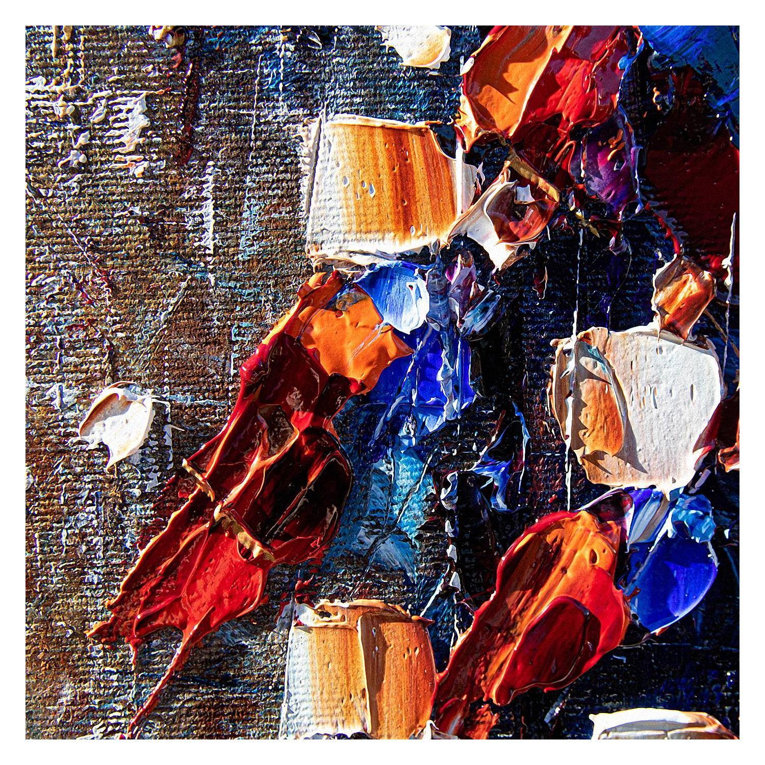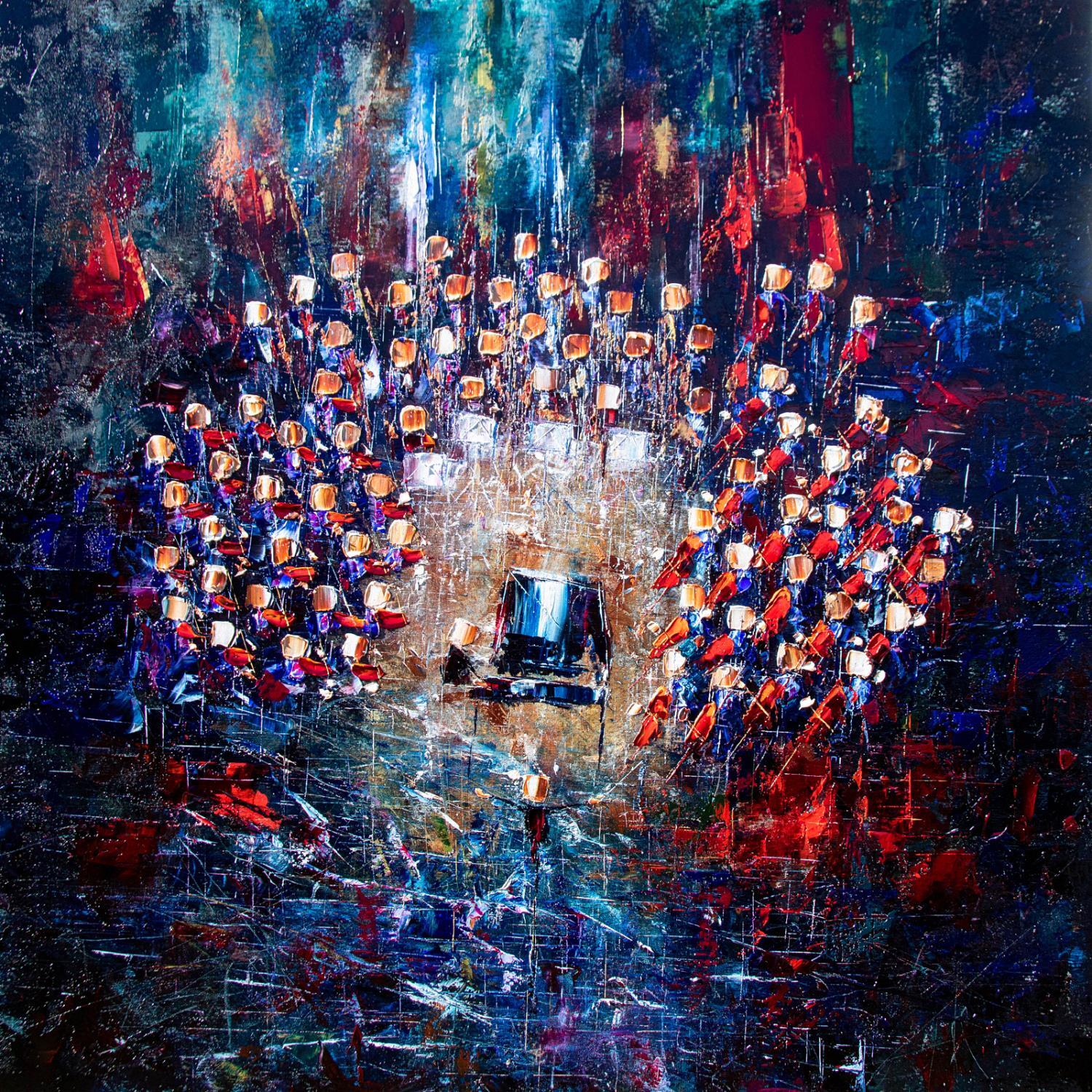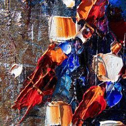 Le concert avec pianiste is a work that oscillates between abstraction in the periphery and naive art in the center and the representation of the instrumentalists. The motif is painted in knife and oil, playing on oppositions between warm (shades of red) and cool (shades of blue and green) colors. The square heads of the figures are inspired by Nicolas de Staël's "Parc des Princes" series. The staging highlights the central pianist, playing on circularity (the formation) and verticality (the background). The conductor, isolated and in a masterly posture, concludes the lower part of the work. The concert is called "French" because of its dominant colors: bleu, blanc, rouge...