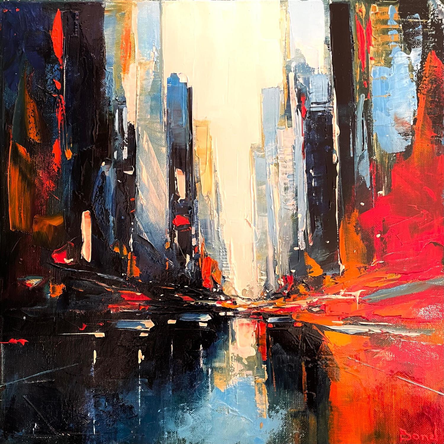 This unique and original contemporary artwork "The flaming city" on the subject of Urban has been created by the contemporary artist Bond Tetiana.