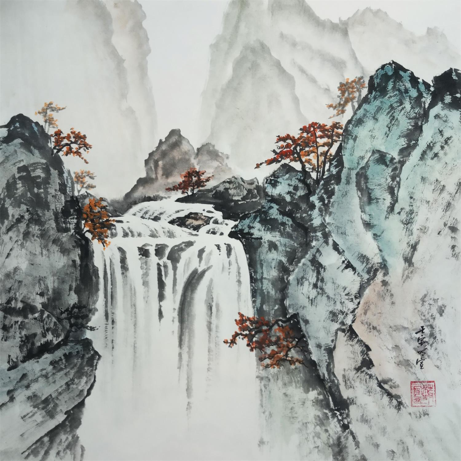 This unique and original contemporary artwork "Autumn Waterfall" on the subjects of Nature, Landscapes has been created by the contemporary artist Du Mingxuan.