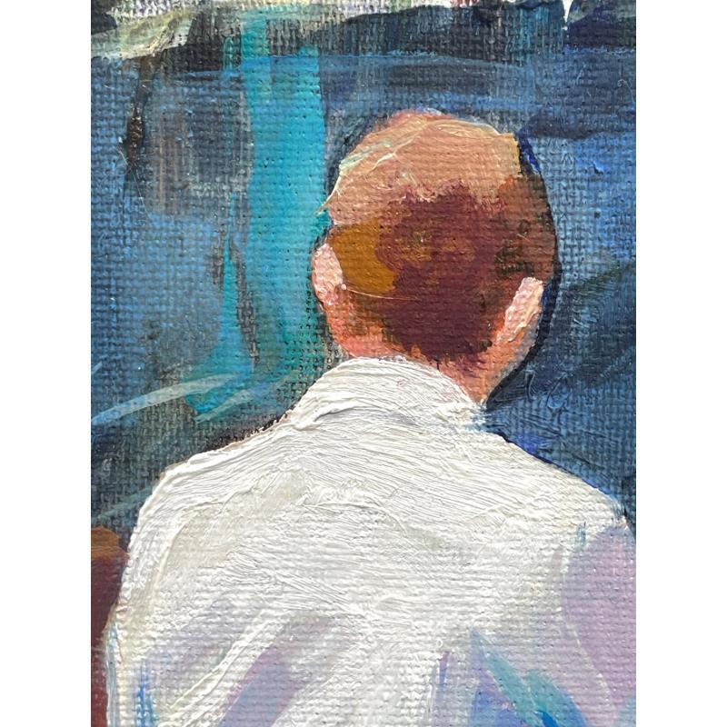 The artist used the oil-on-canvas technique to create this small-format figurative painting.