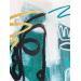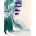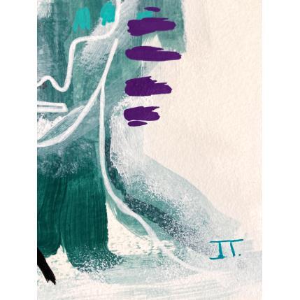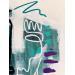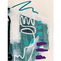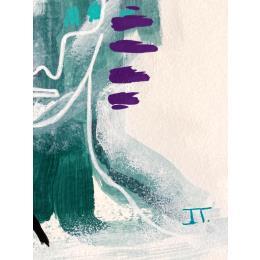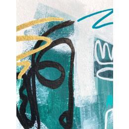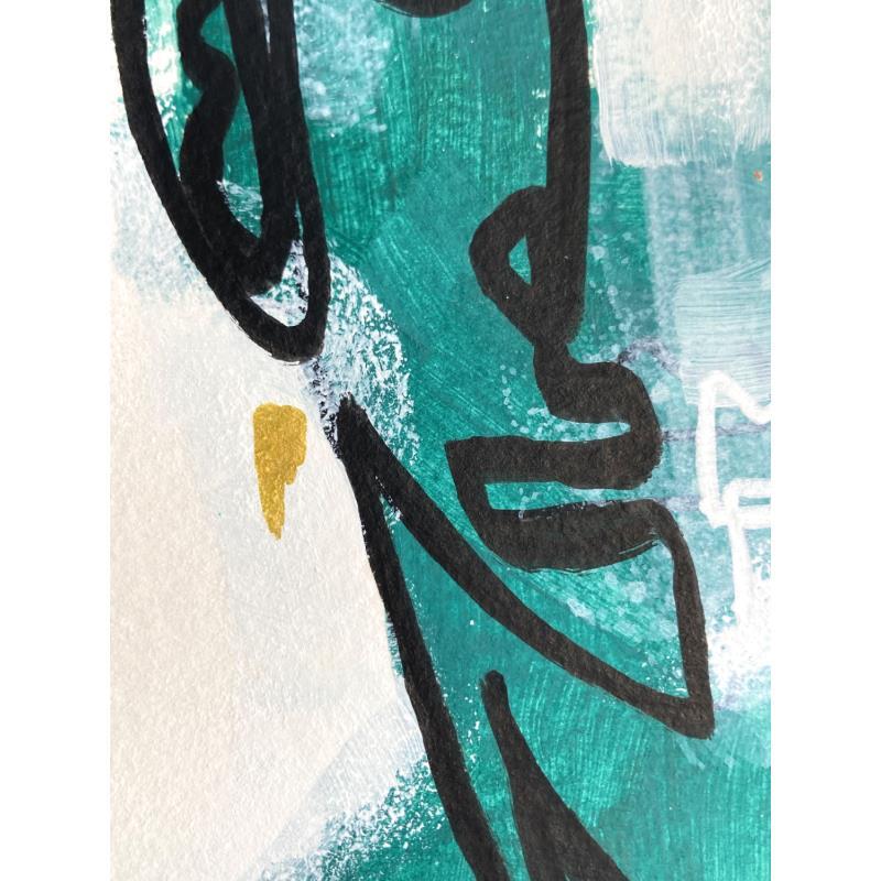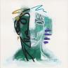 A greenish face emerging from the white mist, with a rather chaotic, organic finish. On the left there are heavier, thicker lines in black and another in gold, while on the right they are lighter and thinner in white, with other lines in turquoise and violet.