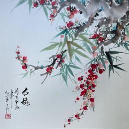 This unique and original contemporary artwork "Red Cherry blossom" on the subject of Nature has been created by the contemporary artist Yu Huan Huan.