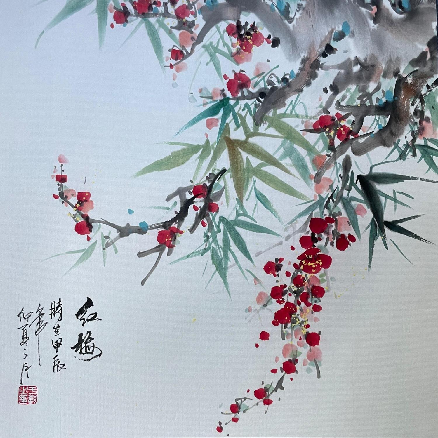 Painting Red Cherry blossom by Yu Huan Huan | Painting Figurative Nature Ink