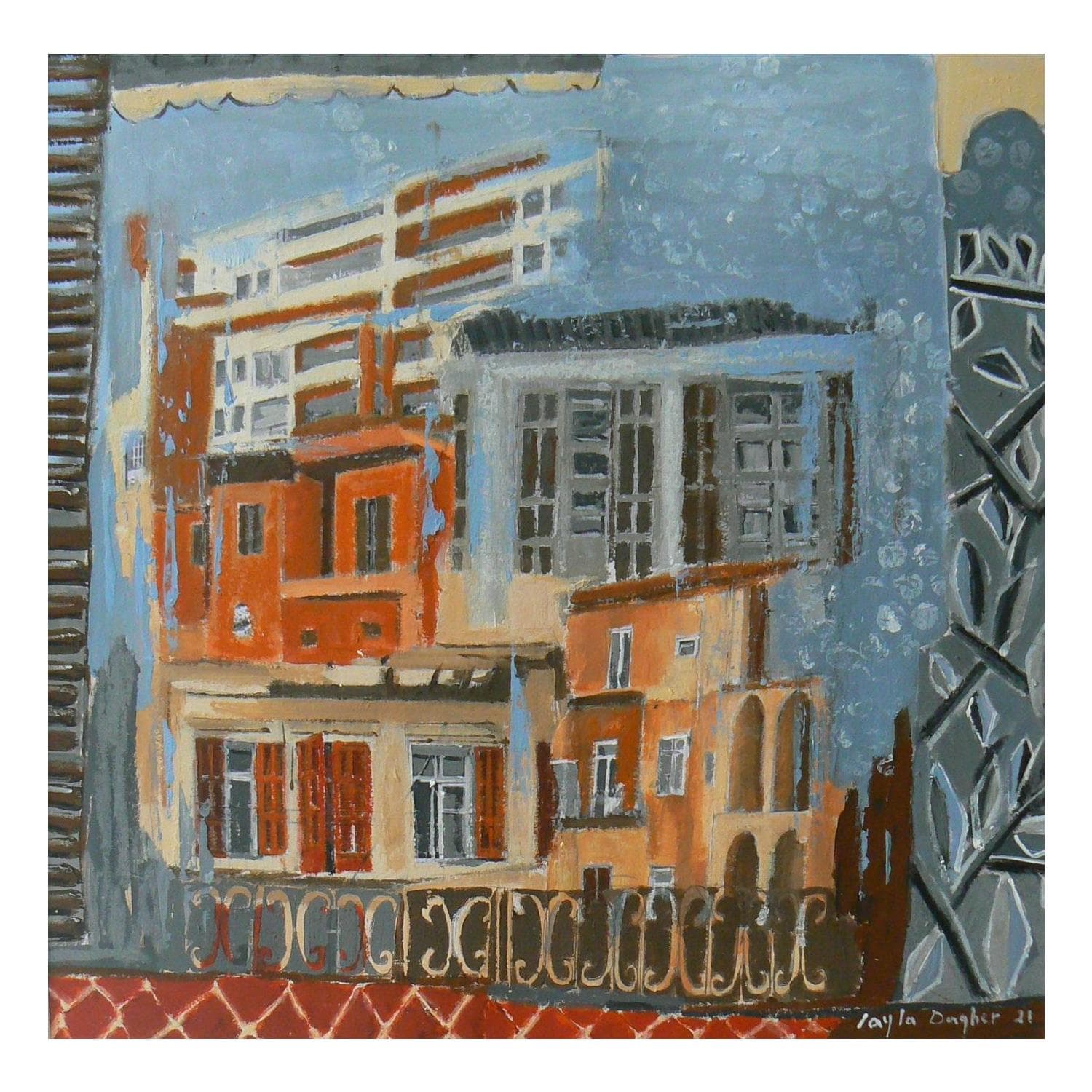 The artist likes to photograph the old houses located in the old districts of Beirut. From there, she composes subtle, half-griffed, half-painted, skilfully worked and richly colored paintings that are both harmonious and textured, oscillating between the artist's will? To pay homage to the unique architectural diversity of her city which, as time goes by, tends to disappear under the impulse of an always growing urbanization.