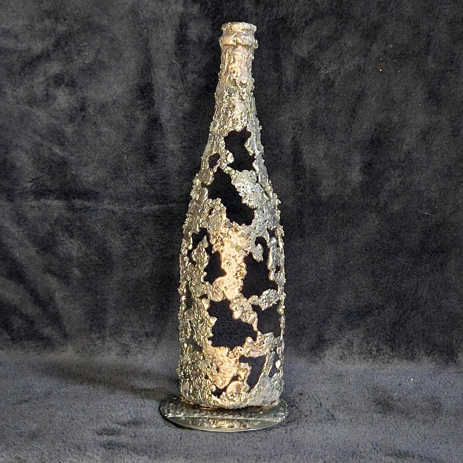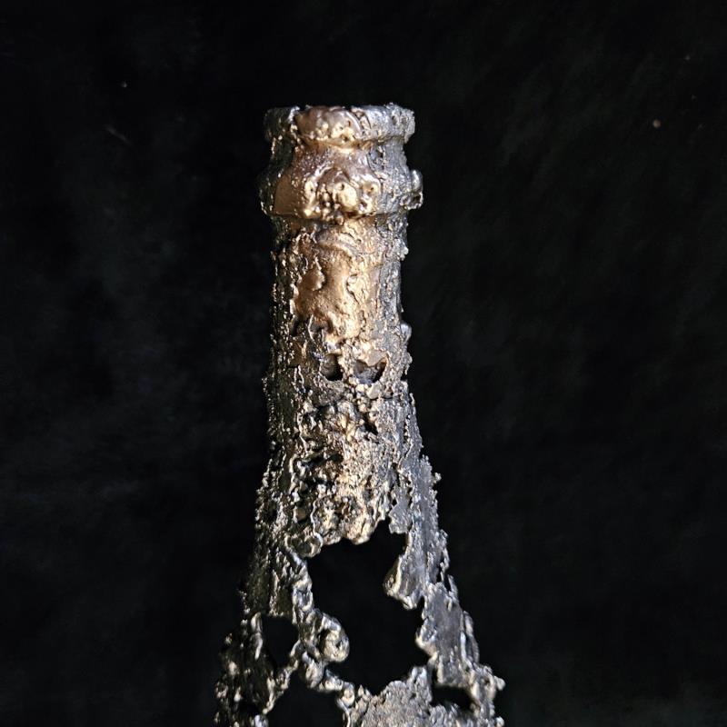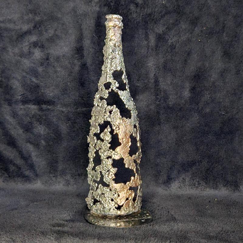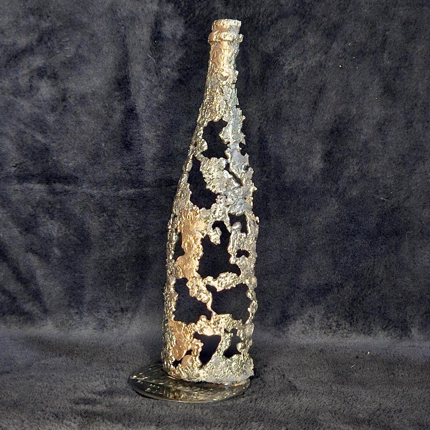 The sculpture represents a bottle of champagne. It is made of metal lace: steel and bronze.