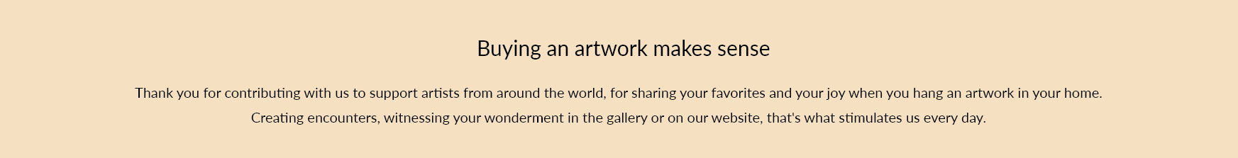 That's why, since our inception, we have been offering collections of artworks at a fair price all year round. These prices are set to support the artists, to remunerate them in line with their work, and to cover our costs: gallery rent, gallery staff salaries and support services, transportation, shipping, communication.