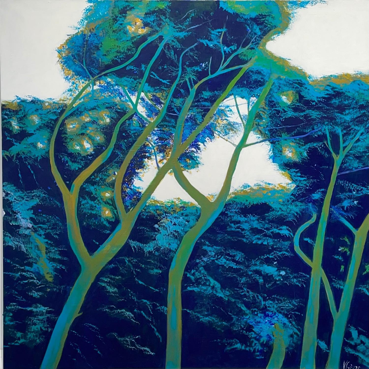 In her landscapes, she sensitively transcribes the raw, untamed nature of the banks of the Loire, the immensity of the beaches of the Atlantic coast, or the luminosity of Mediterranean villages. Her colorful tree canopies plunge us into a universe both majestic and enigmatic. ...She takes part in regional, national (Salon d'Automne, Art Capital) and international (Mexico, Italy, USA, Sweden) exhibitions.