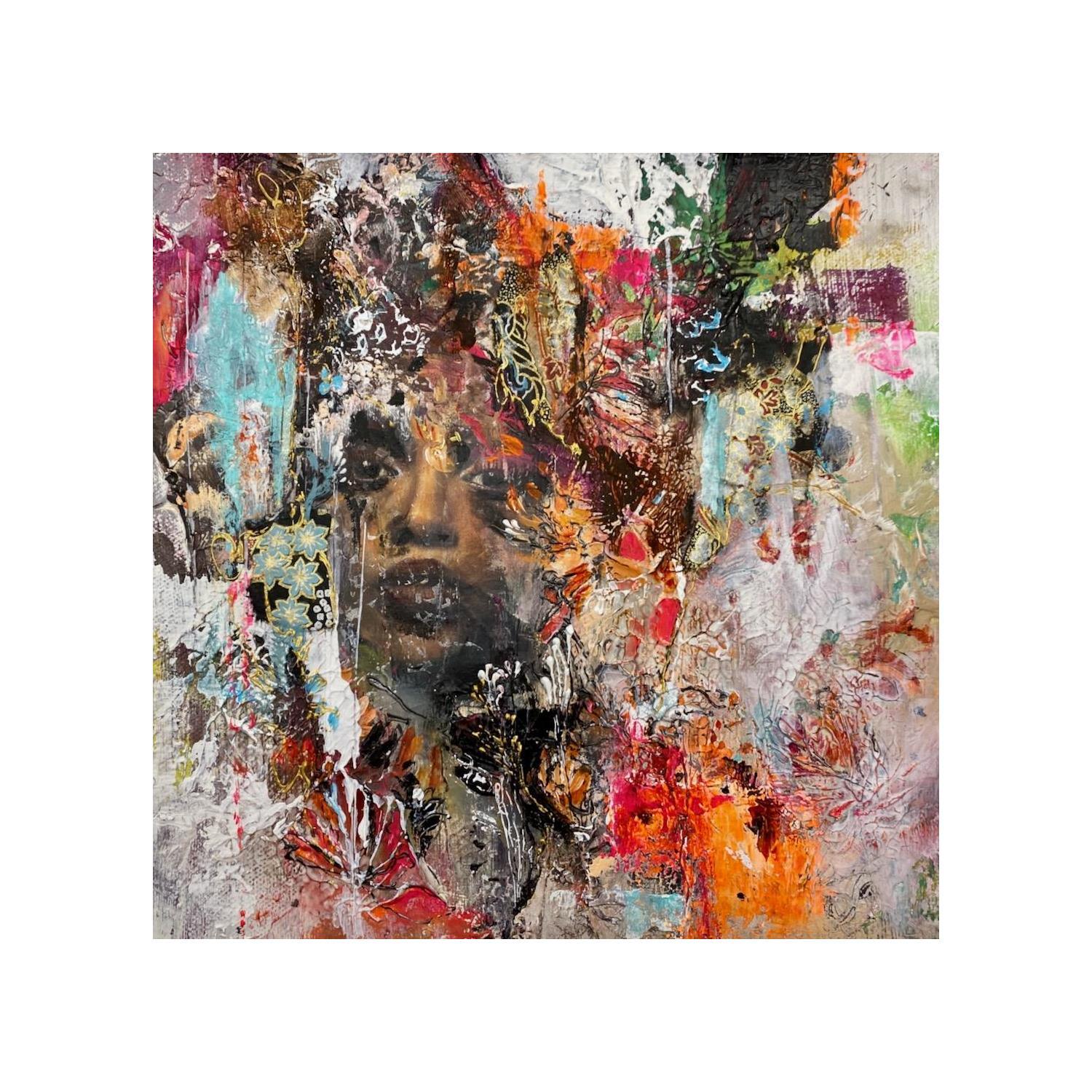 The artist used Gluing, Oil, Acrylic media on Canvas to create this Figurative, Small size painting.