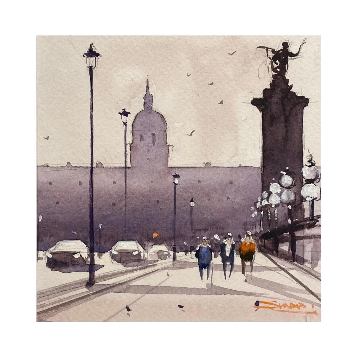 Pintura Walking on Pont Alexandre III por Dandapat Swarup | Pintura Figurative Landscapes Urban Life style Watercolor
