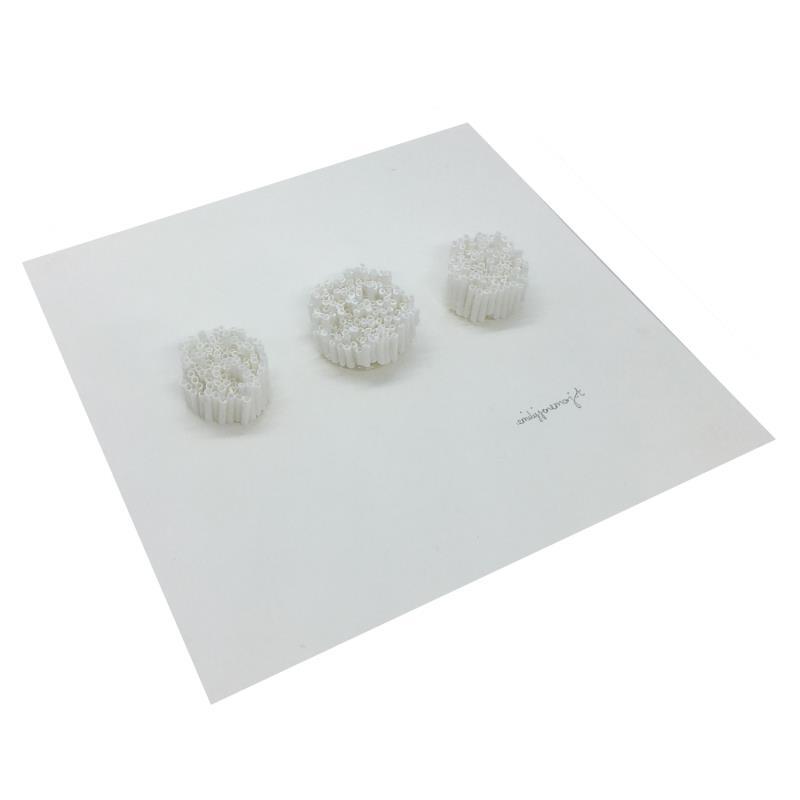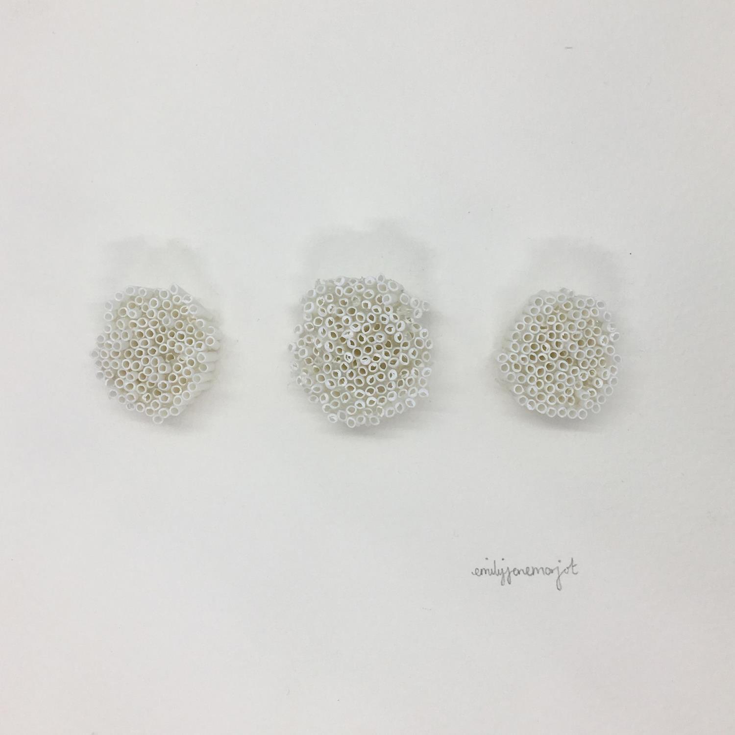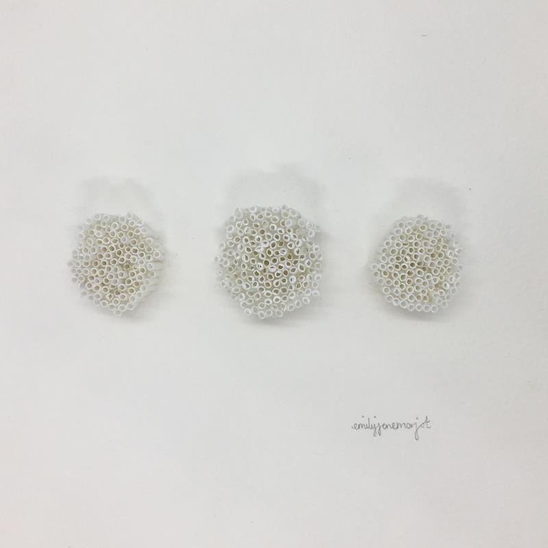 Having graduated from the School of Fine Arts in Kingston (UK) in 2012, Emily has exhibited her work in various London galleries. Her unusual compositions are closely related to her health issues. Bodily pain and the medical world have a major influence on her work. The application and repetition inherent in her stacked works captivate her attention and divert her from her suffering. Emily's art is the result of an intensive and obsessive process. However, her long-term work remains open to surprises; the artist is not trapped in a predefined logic. Very sensitive to aesthetics, she is guided by her taste for delicate and subtle arrangements.