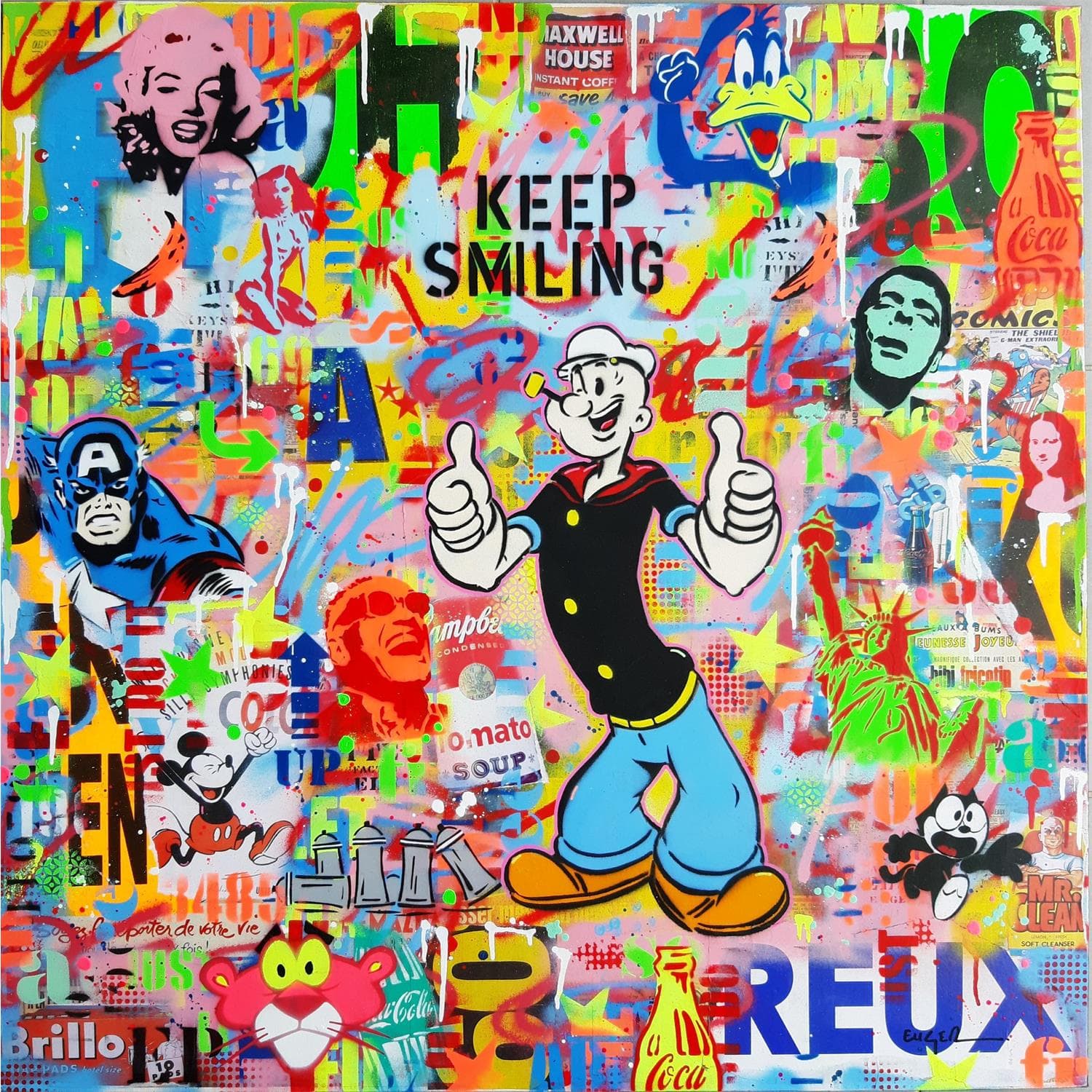 This unique and original contemporary artwork "Keep smiling" on the subject of Pop icons has been created by the contemporary artist Euger Philippe.