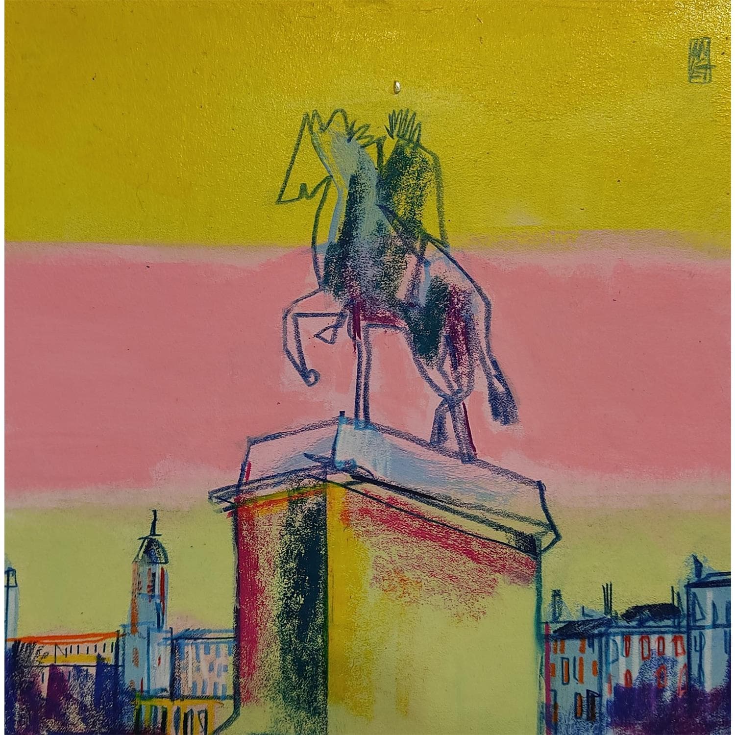 This unique and original contemporary artwork "Vue sur la place" on the subjects of Landscapes, Urban has been created by the contemporary artist Anicet Olivier.