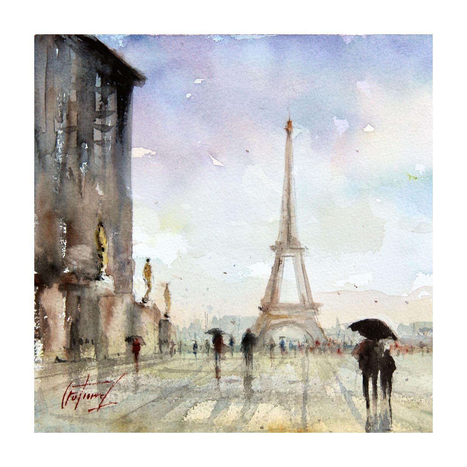Pluie sur le TrocadéroPintura Pluie sur le Trocadéro por Gutierrez | Pintura Figurative Urban Watercolor