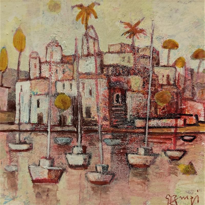 This unique and original contemporary artwork "AN125 Le petit port rose" on the subjects of Landscapes, Marine has been created by the contemporary artist Burgi Roger.