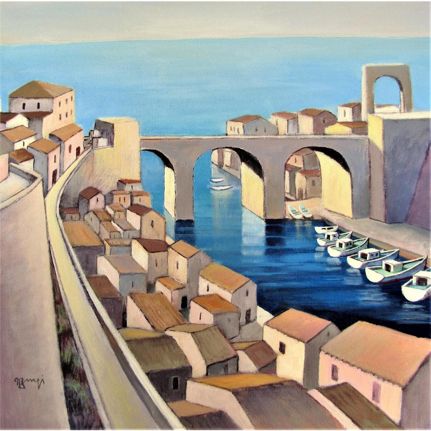 This unique and original contemporary artwork "A013 Les toits du Vallon" on the subjects of Landscapes, Marine, Urban has been created by the contemporary artist Burgi Roger.