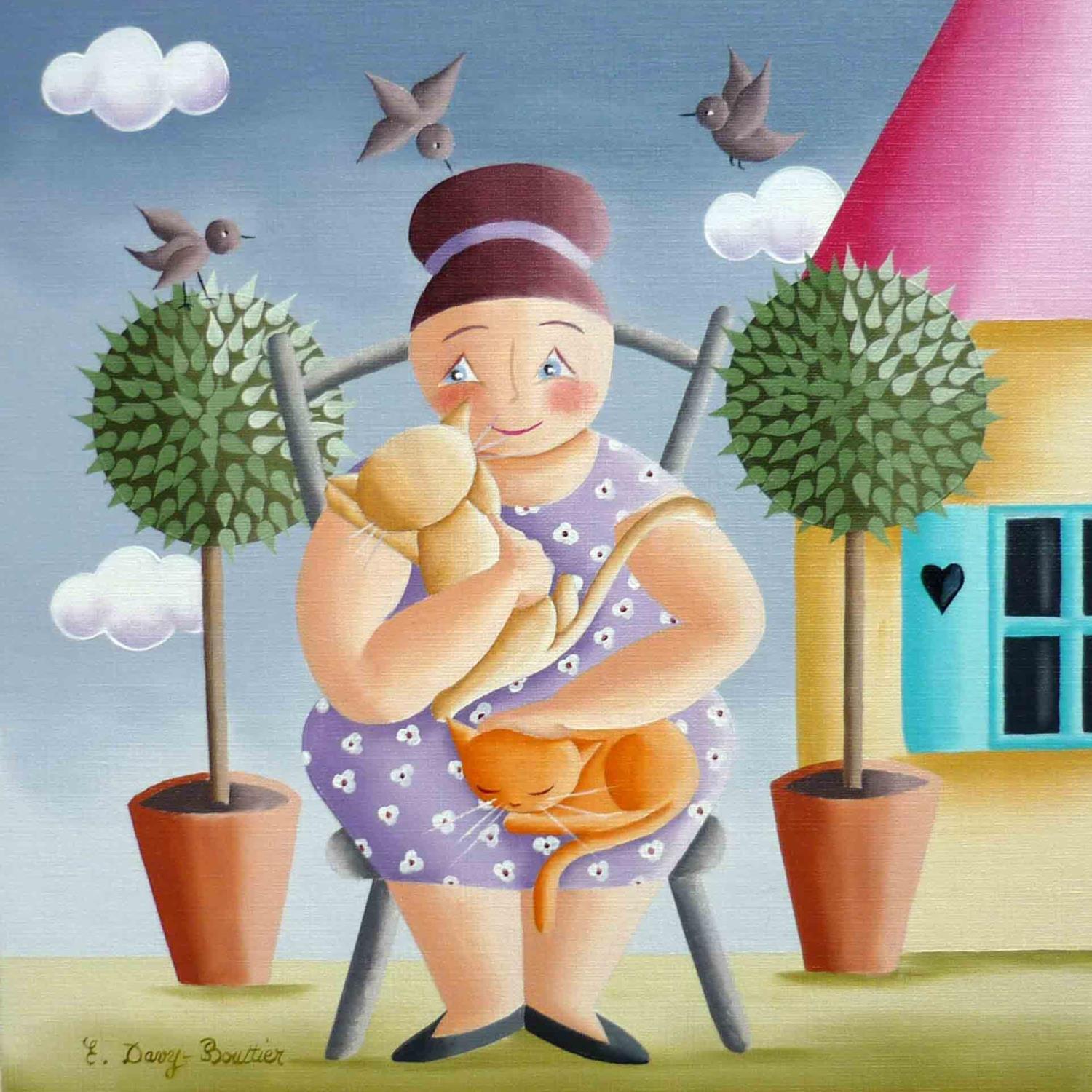 Pintura Chats calins por Davy Bouttier Elisabeth | Pintura Naive art Portrait Oil