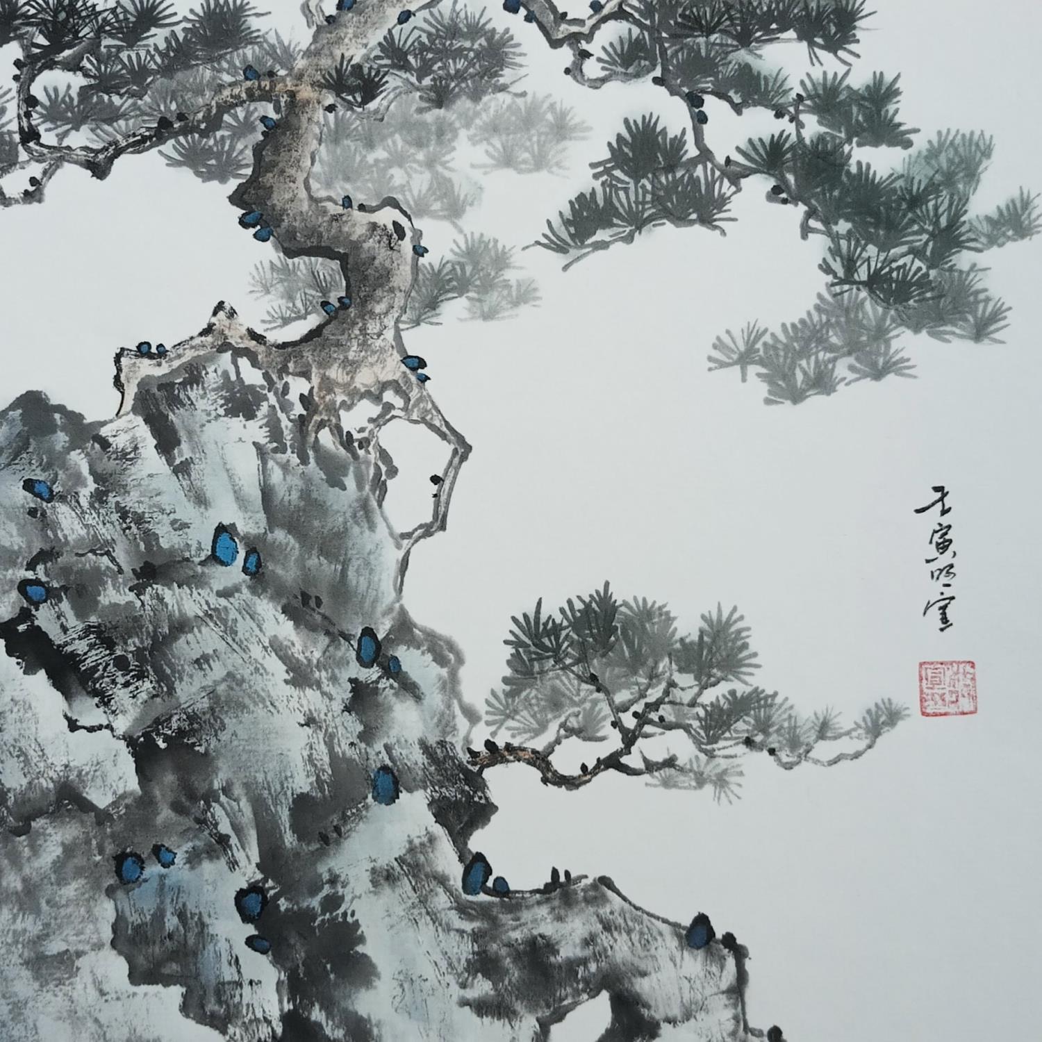 This unique and original contemporary artwork "Pinetree and cliff" on the subjects of Landscapes, Nature has been created by the contemporary artist Du Mingxuan.