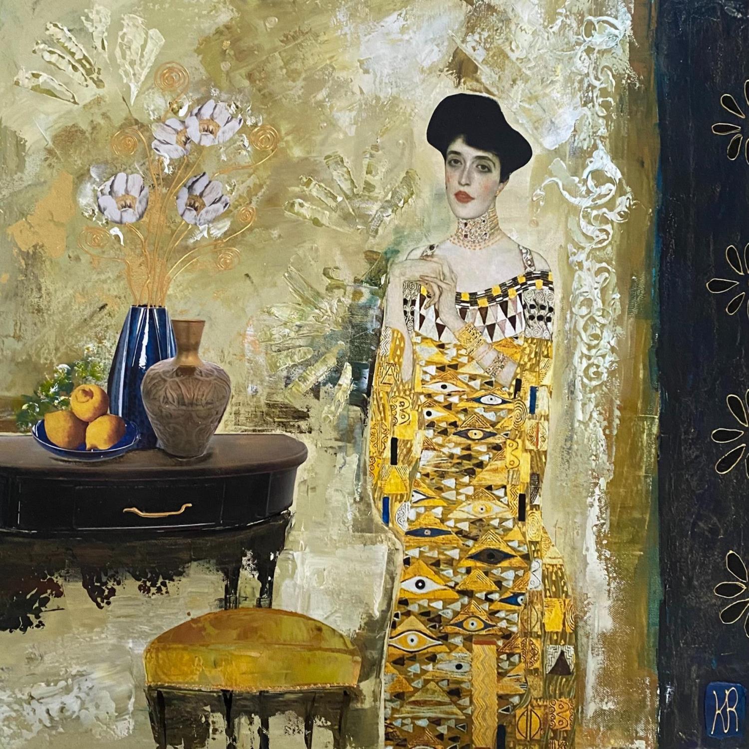 This unique and original contemporary artwork "Amber" was created by the contemporary artist Karine Romanelli, who used the Mixed media technique to create this large format painting on canvas in a figurative style. Inspired by Klimt, this woman painted by the great master has been reintegrated into a contemporary setting.