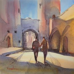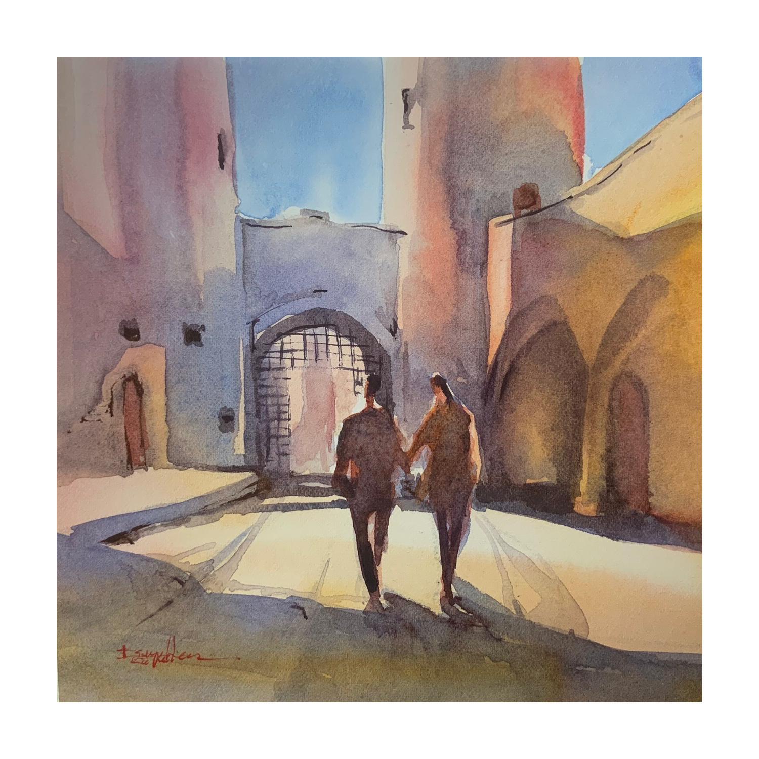 The artist used the Watercolor technique to create this small format painting on paper of Figurative style on the theme Urban Views.