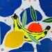 This unique and original contemporary artwork "Yellow Lemon and a Yellow Banana over Blue" was created by contemporary artist JuLIaN.