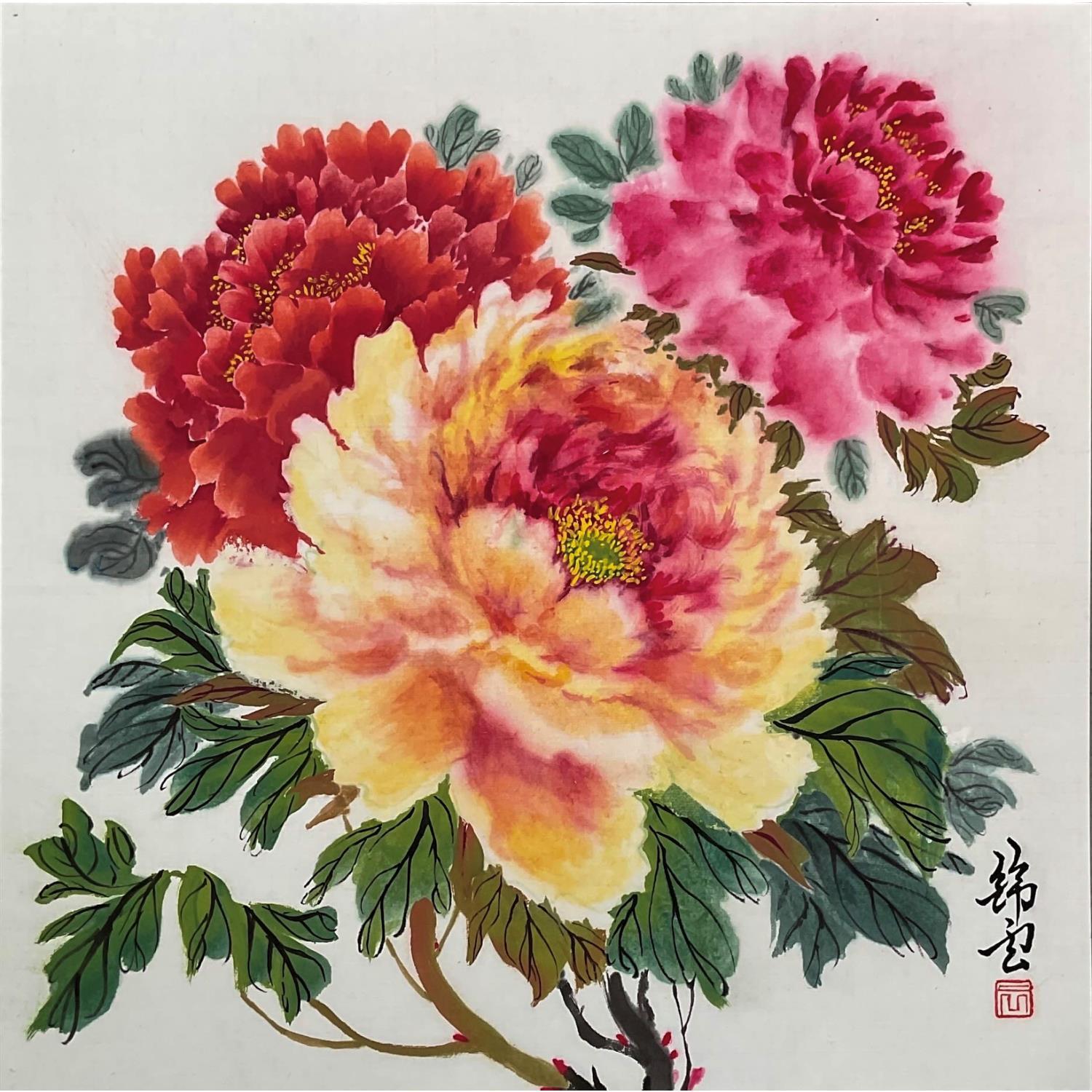 This unique and original contemporary artwork "Three Peonies" was created by contemporary artist Tayun. The artist used the Mixed media technique to create this small format painting on paper in the Figurative style.