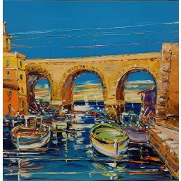 This unique and original contemporary artwork "Barques au Vallon des Auffes" on the subject of Landscapes has been created by the contemporary artist Corbière Liisa.