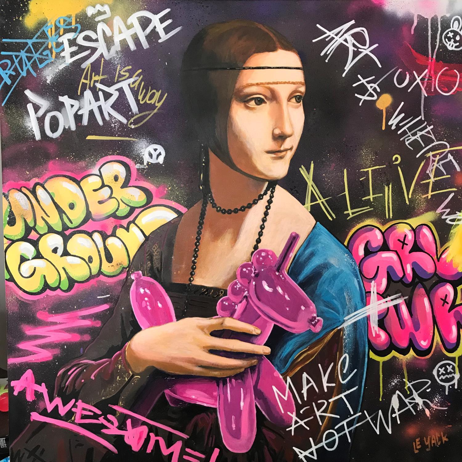 The artist used the techniques Graffiti, Acrylic to create this large format painting on canvas of Pop Art style on the theme Pop icons.