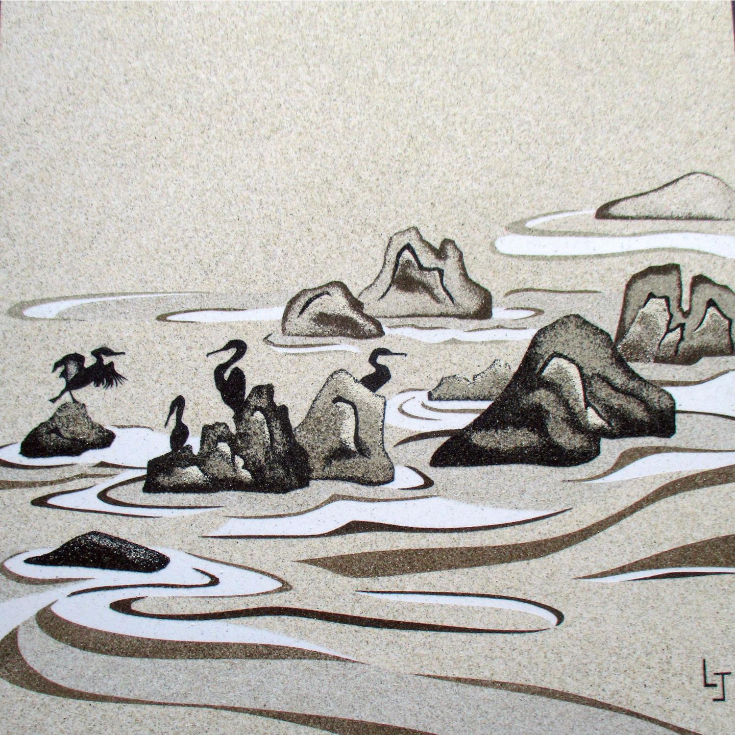 It was during a stay in New Caledonia that Laurence JOVYS was introduced to the art and technique of sand painting, so delicate and singular. On her return to France, she naturally devoted herself to creation, combining her interest in natural sand paintings with her passion for the maritime environment. Aquatic fauna, beaches, seabirds, seaweed...