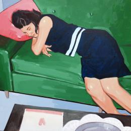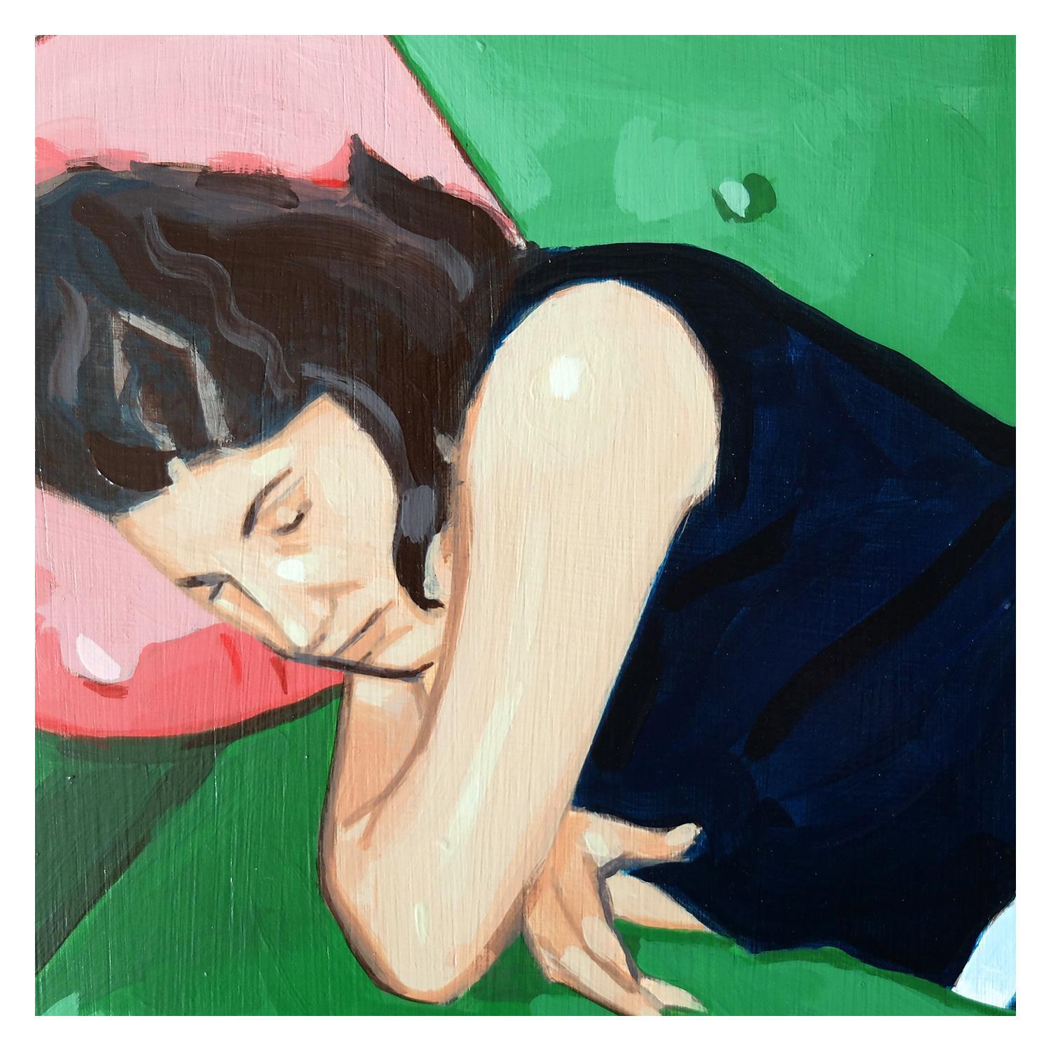 This unique and original work of contemporary art “Napping on the green sofa” was created by the contemporary artist ZIM. The artist used the acrylic technique to create this Figurative style painting on wood.